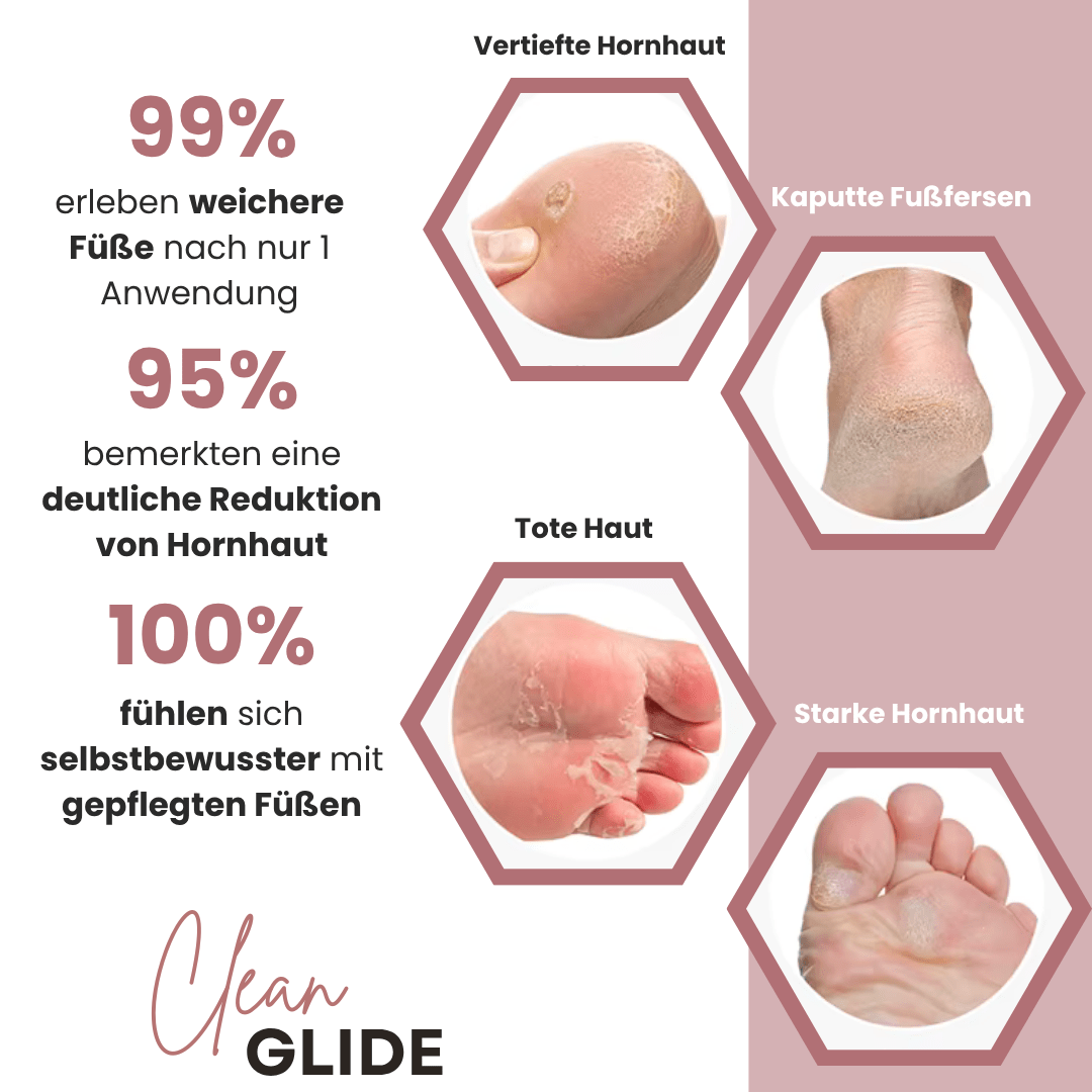 CleanGlide entfernt selbst hartnäckige Hornhaut in Minuten – sanft, schmerzfrei und zuverlässig von zu Hause aus.